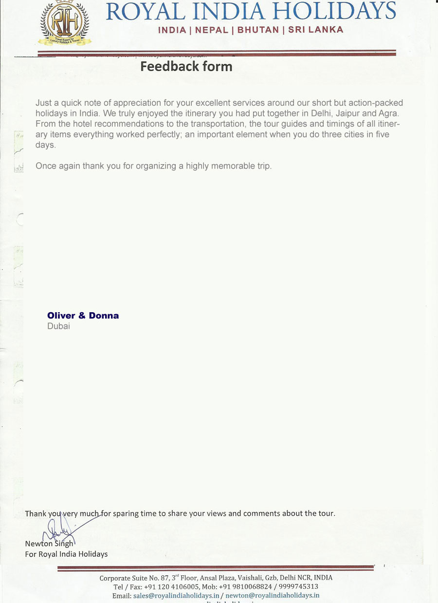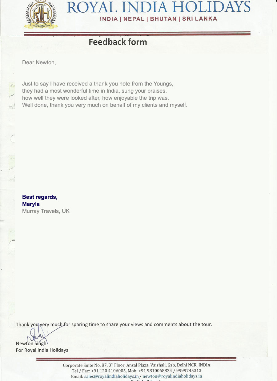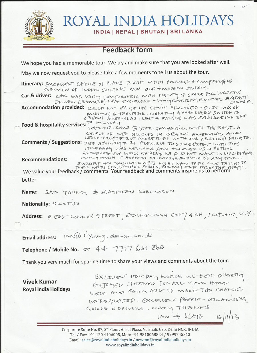 - Ian Young and Kathleen Robertson United Kingdom, Tailor made luxury tour.The tour was very well organized and was exactly as planned. We both thoroughly enjoyed our luxury tour. This was the best holiday and we had some wonderful experiences and memories which we will cherish all our lives. We will have no hesitation in recommending Royal India Holidays to our friends and relatives.