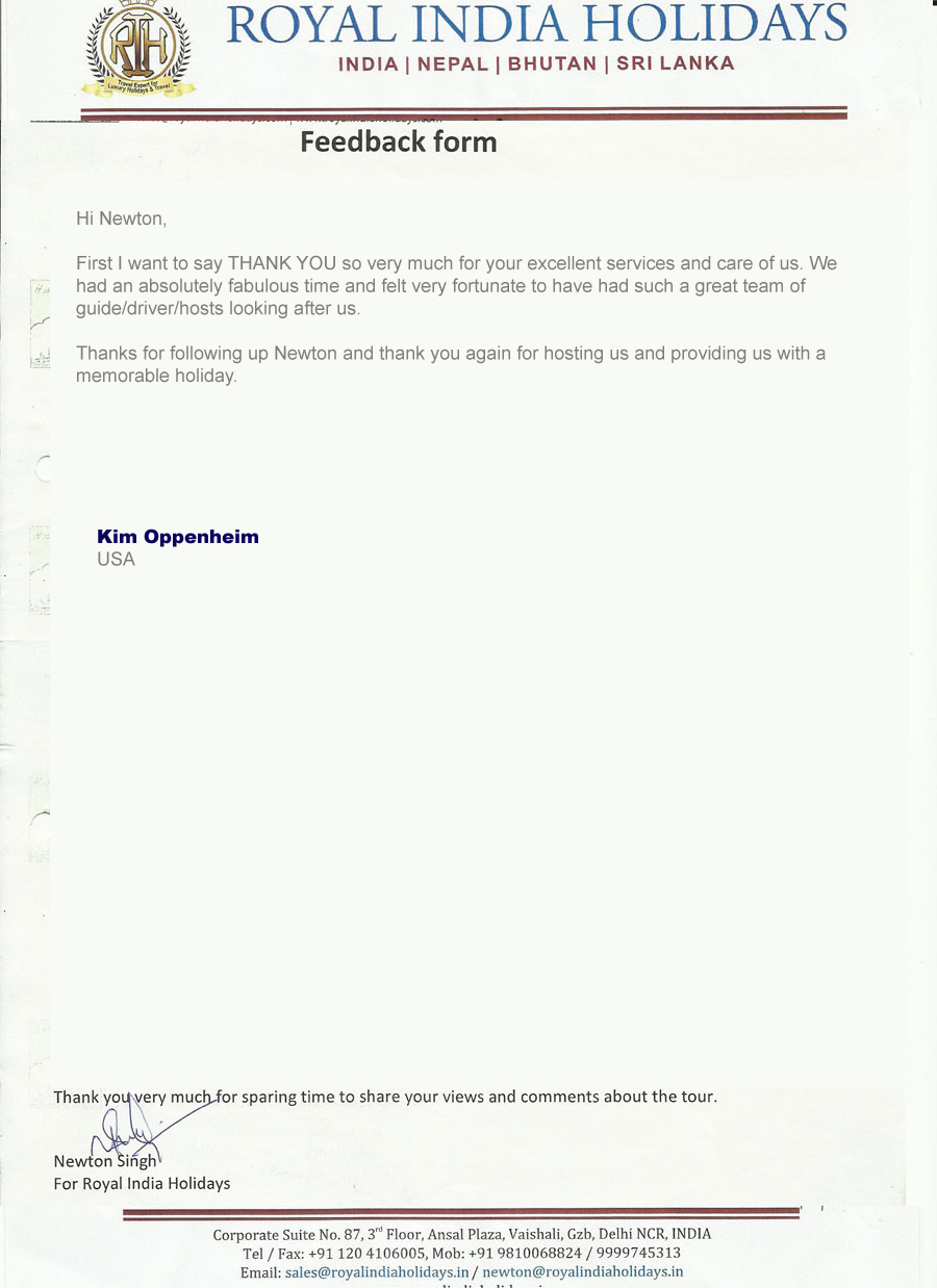 - Kim (and Jamie, Jenna, and Kera) made group tour, SwitzerlandMy husband and I, along with our 2 daughters and a group of 5 students from the international high-school where we teach in Switzerland, just returned from a two-week tour of Kerala organized by Newton Singh at Royal India Holidays. It was in fact one of the best trips we have ever taken, and that is largely thanks to Newton—his energetic participation, his knowledge and constant help, and his warm companionship.