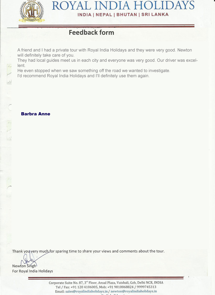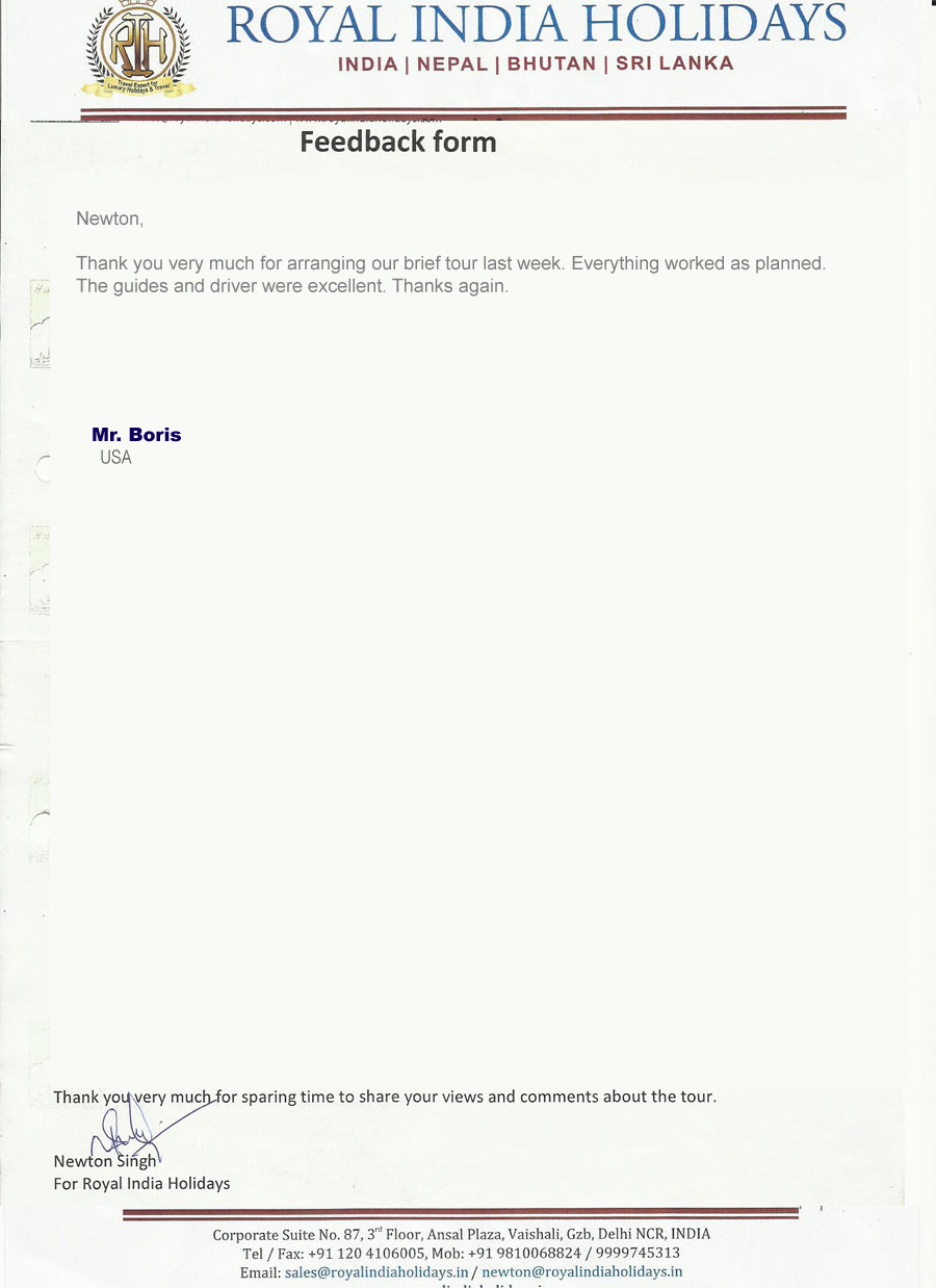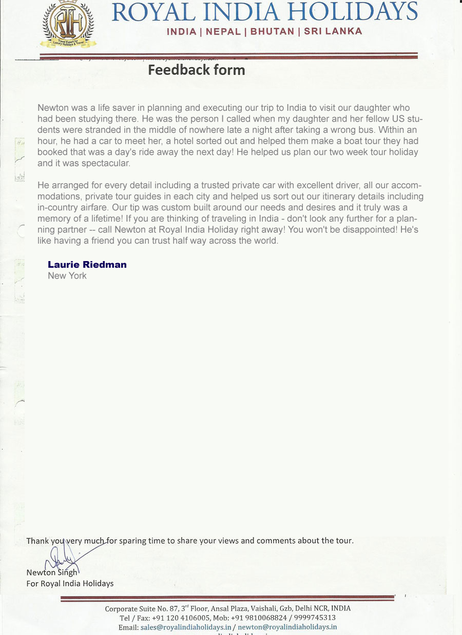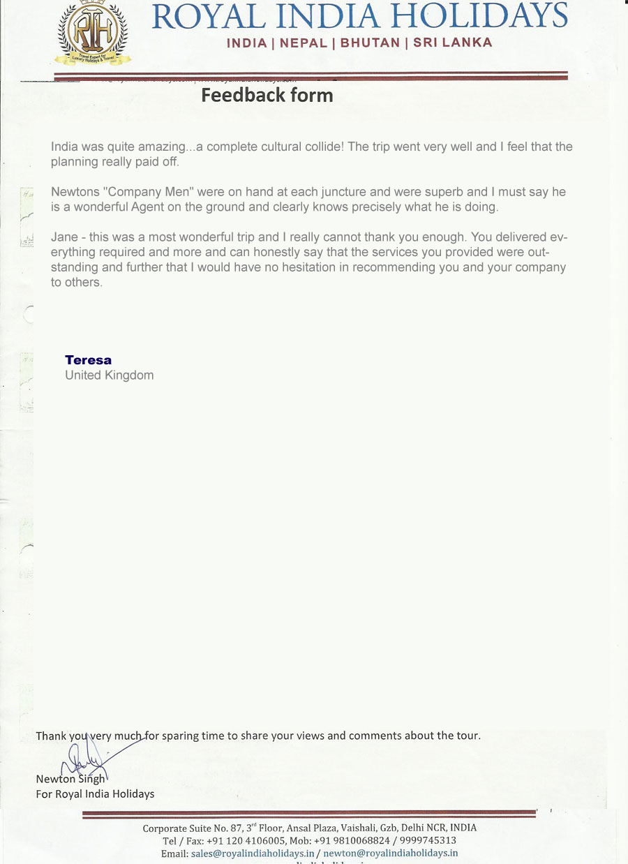 - Teresa United Kingdom, Tailor made North India tourNewton was a life saver in planning and executing our trip to India to visit our daughter who had been studying there. He was the person who I called when my daughter and her friends were stranded in the middle of nowhere late at night after talking a wrong bus. Within an hour, he had a car to meet her; a hotel sorted out and helped them make the boat tour. He helped us plan our two week holiday in India and it was spectacular.