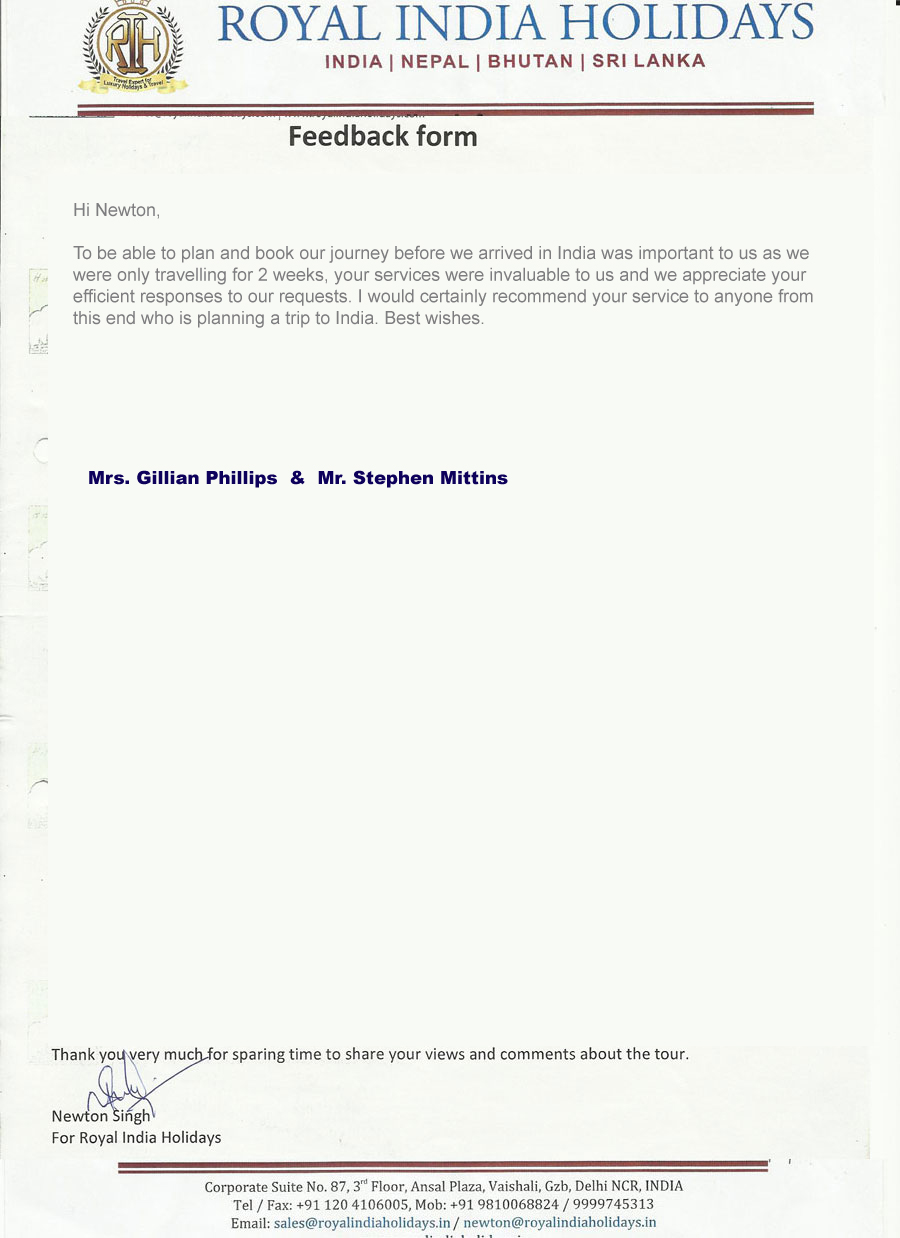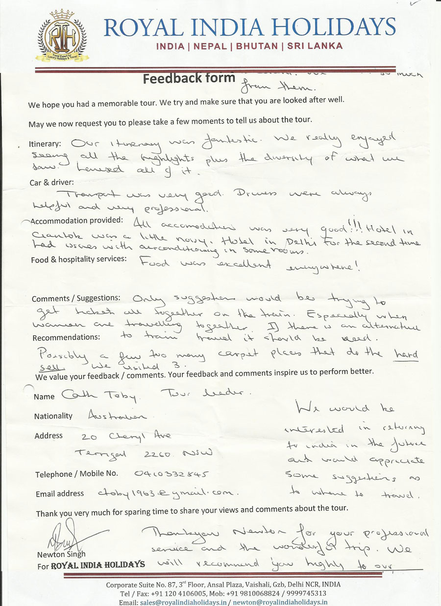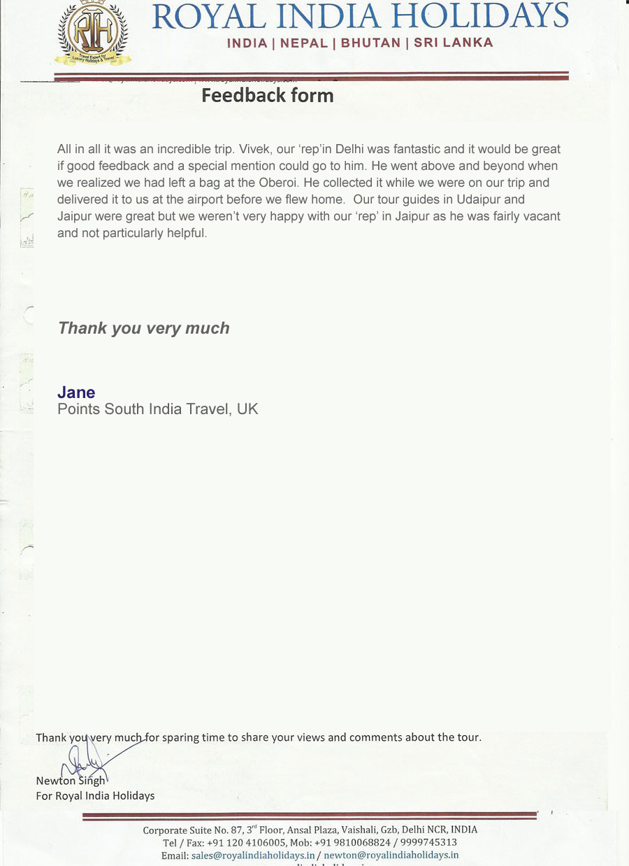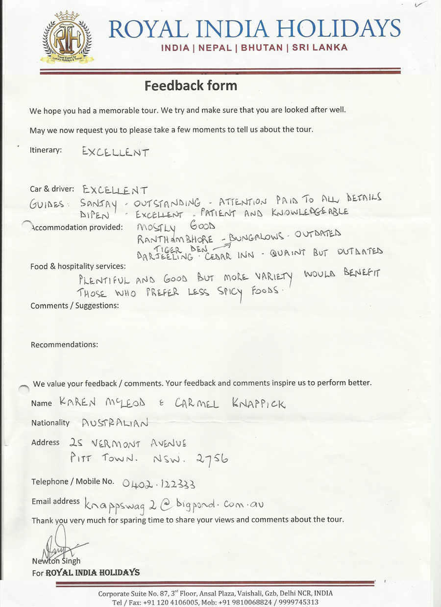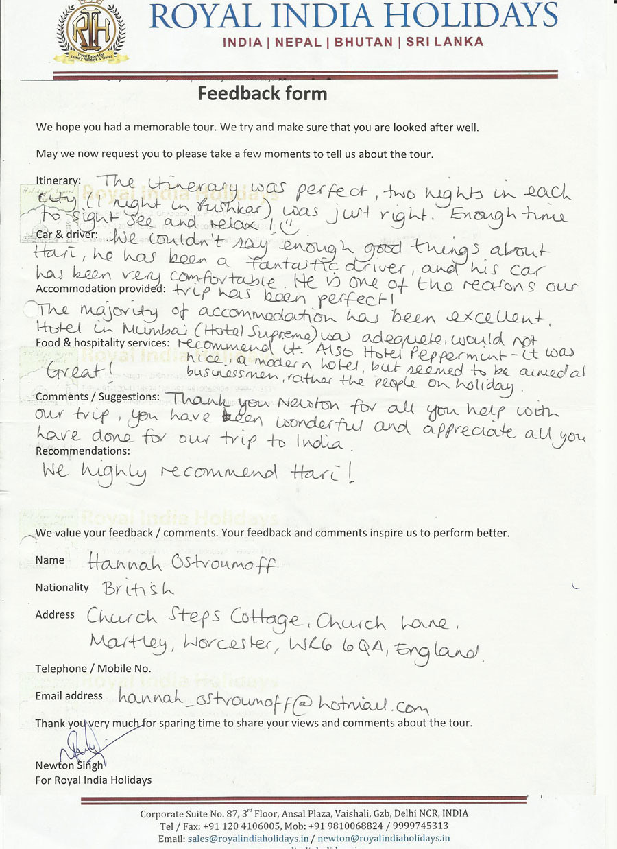 We can highly recommend this trip and next time we come to India, we will be contacting you to make the arrangements.