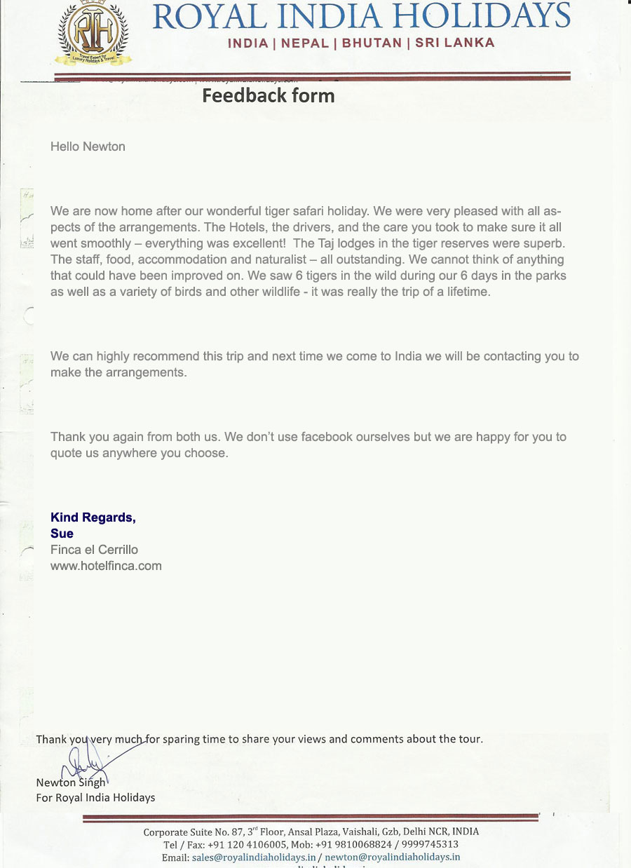 - William Dryer United Kingdom, Tailor made tourWe are home now after our wonderful tiger safari holiday. We were very pleased with all the aspects of the arrangements. The hotels, the drivers and the care you took to make sure it all went smoothly – everything was excellent.