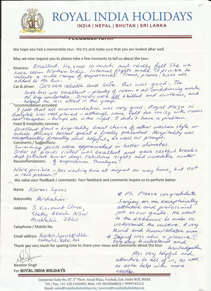 - Karen Lyons New South Wales, Australia, Tailor made group tourIndia was quite amazing…. A complete cultural collide! The trip went very well and I feel that the planning really paid off. Newton’s company men were on hand at each juncture and were superb and I must say he is a wonderful agent on the ground and precisely knows what he doing.